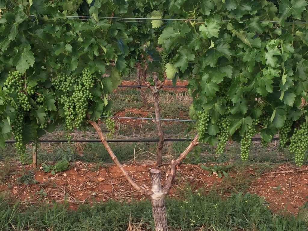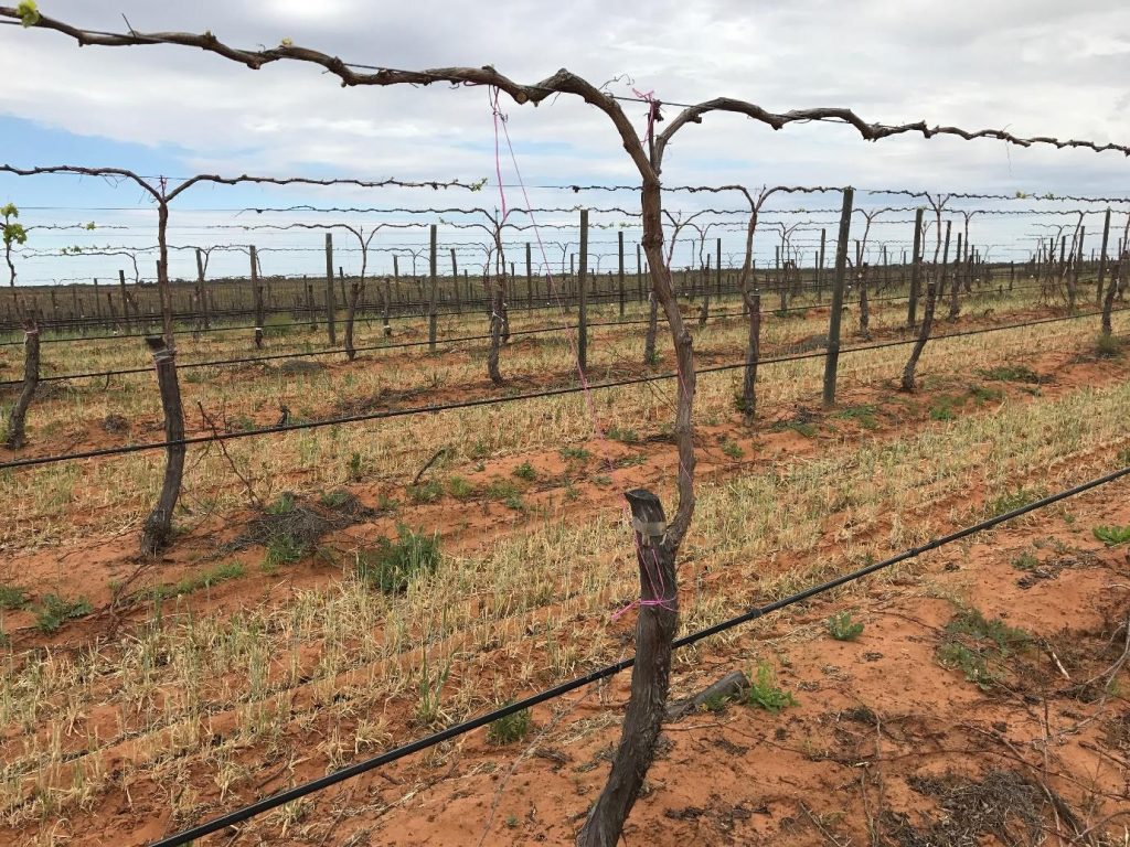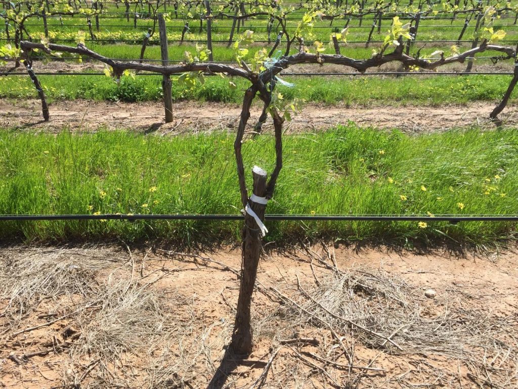 At pruning: Once dormant at pruning unwrap the canes and cross them over at the middle and place on the cordon wire in opposite directions. This is called the “Cross over” technique. It will result in a strong vine structure able to withstand machine harvesting in the first harvest after grafting as well as close I the crown to have 2 or 3 spurs where there would heve been a gap if the “cross over” wasn’t used.