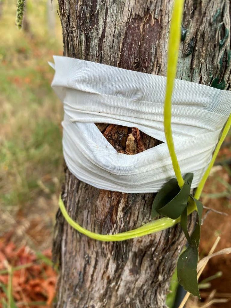 When grafted shoots are not supported correctly the weight of the shoot cannot be supported by the bud union with the trunk and the shoot pulls the bud out of the trunk. This is referred to by grafters as a “blowout”. This occurs because the grafted shoot cannot support itself as the bud union is usually soft in the first year of callusing until dormancy and cane lignification is reached at the end of the season. The weight of shoot growth and the assistance of wind then cause the bud to fall oput of the trunk. This can result in a full blowout or a partial blowout where the bud will survive and only partially callus across the lower cut.