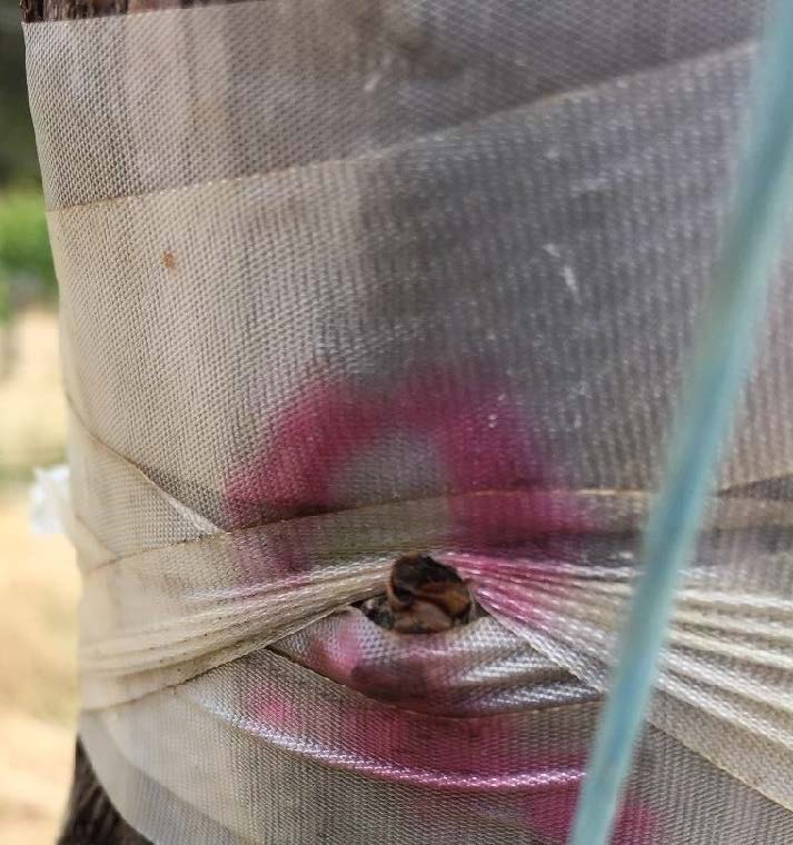 To alleviate the buildup of sap behind grafted buds, a single cut using a fold out pruning saw should be made under each bud. A knife is not a good substitute for the saw. It is the thickness of the saw blade that make the cut wide enough to release the sap for the period of time to be effective for the bud to callus. A knife cut is too narrow and will grow over and not be effective in releasing the sap for long enough to be effective. The saw only needs to be pulled in a single action towards the person making the cut. Do not make any more cuts deeper than a single movement saw cut. Ask the grafters to show you if you are in doubt. It is rare for these cuts to be necessary and a single cut is usually enough to be effective. Sometime in really wet soils and in some seasons, a second cut maybe necessary and this should be made below the original cut. Always consult your grafting contractor before making these cuts.